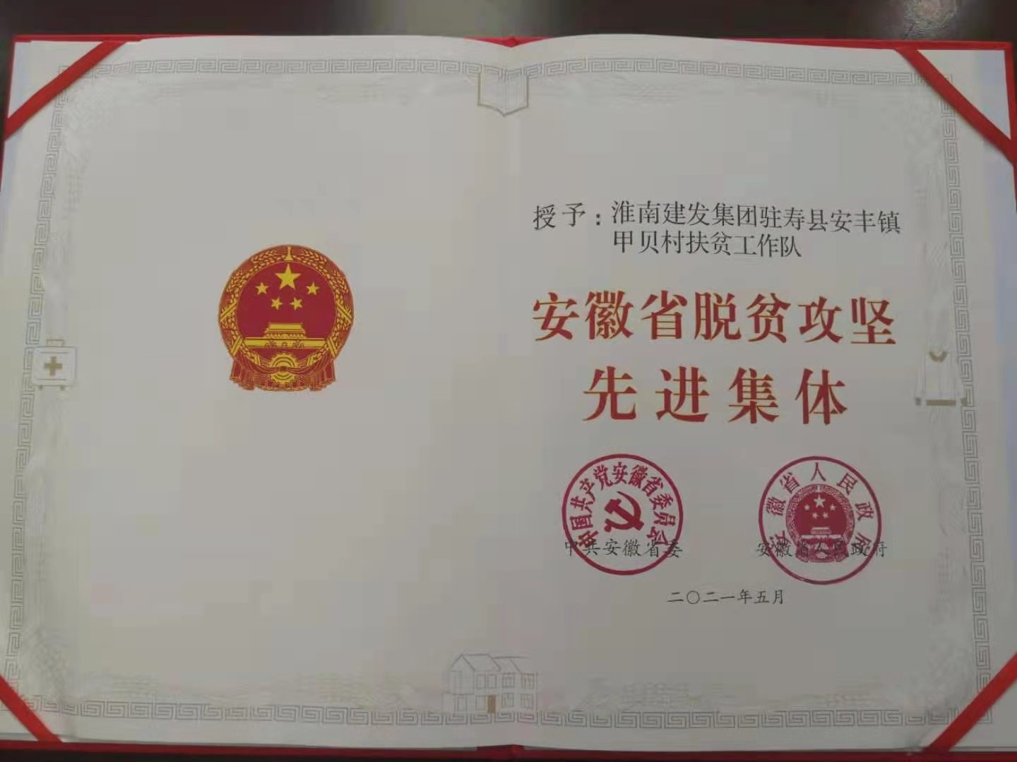 會議宣讀了《中共安徽省委安徽省人民政府關(guān)于表彰安徽省脫貧攻堅先進個人和先進集體的決定》,省領(lǐng)導為受表彰的先進個人和先進集體代表頒獎。建發(fā)集團駐壽縣安豐鎮(zhèn)甲貝村駐村工作隊在表彰中獲“安徽省脫貧攻堅先進集體”榮譽稱號。