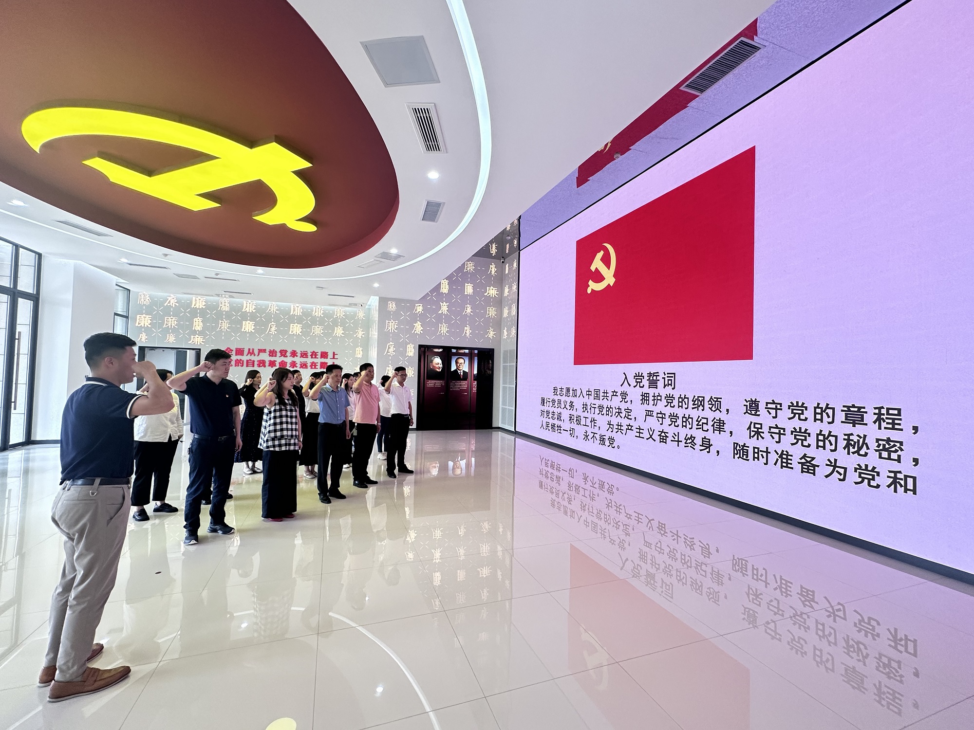 參觀中,黨員們領(lǐng)略了中華民族自古以來(lái)的廉政文化精髓,從古代清官廉吏的嘉言懿行到革命先輩的廉潔自律事跡,深刻感受到廉政文化的深厚底蘊(yùn)和傳承價(jià)值。通過(guò)一樁樁、一件件反面典型案例,深刻揭露了腐敗分子因思想滑坡、信念動(dòng)搖、貪欲膨脹而導(dǎo)致的嚴(yán)重后果,讓大家真切地感受到“莫伸手,伸手必被捉”的深刻警示。隨后,全體黨員重溫了入黨誓詞。面對(duì)鮮紅的黨旗,大家高舉右手,莊嚴(yán)宣誓,鏗鏘有力的誓言在大廳內(nèi)回蕩,表達(dá)了對(duì)黨的忠誠(chéng)和為黨的事業(yè)奮斗終身的堅(jiān)定決心。